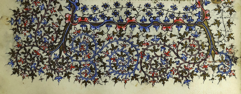 Additionally, when we look at the border drolleries, we can see they are closely related and likely painted by the same hand as well. The patterns are quite similar despite only a few drolleries in the Beatty leaves remaining in good condition. The lack of padding, tightly squeezed spacing between the border foliage, is unusual as well.
