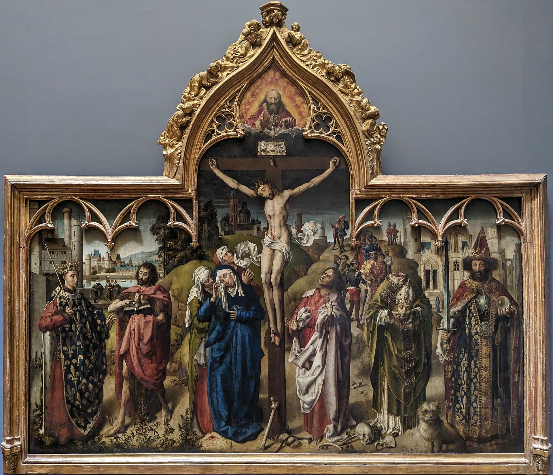 Comparison can be made with saint in the bottom left of The Crucifixion from the Parliament of Paris, given to Franco-Burgundian painter and manuscript illuminator André d'Ypres.