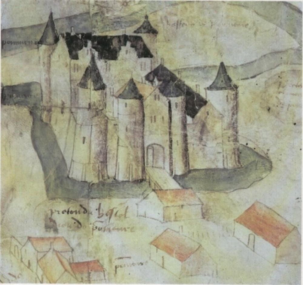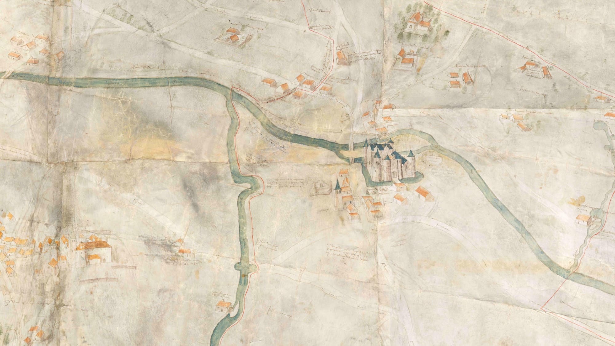 One of the directly documented and dated (1526) works of Gauthier de Campes is a map painted on parchment depicting the Abbey of Faremoutiers and the castle of Pommeuse. This map was originally made as a "figure judiciaire" in the context of a lawsuit before the Parlement de Paris to settle jurisdictional rights between the abbey of Faremoutiers and the seigneurie of Pommeuse. It was recently rediscovered by Raphaele Skupien in the Departmental Archives of Seine-et-Marne. The map is extremely large, measuring 2.65 by 2.25 meters.