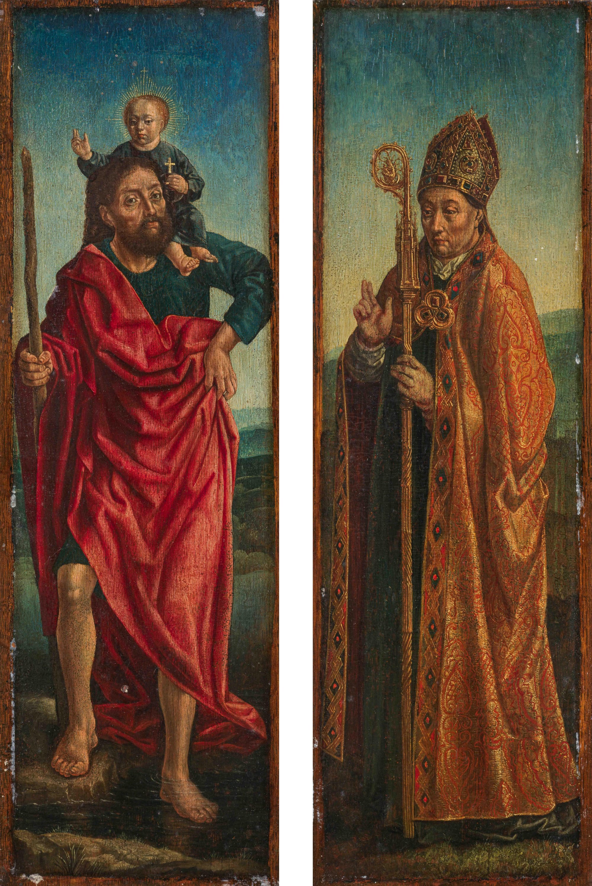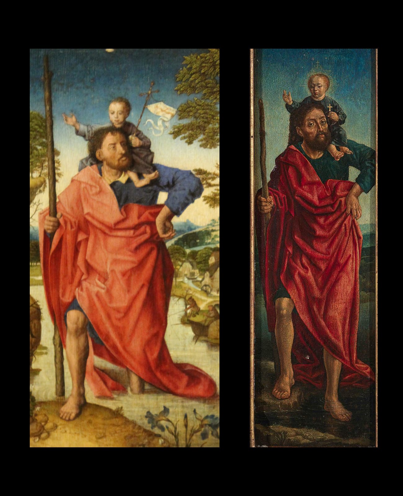 For another option, one could speculate that a productive workshop such as the Master of the Embroidered Foliage could have been the 7-man workshop of Jan Fabiaen. It seems plausible due to the large number of different hands associated with the workshop, and also the fact that some works were very close to the Master of Saint Giles. There aren't 7 different hands in the Master of the Legend of Saint Lucy's oeuvre, although there are probably more than a few. Specifically, Guy-Michel Leproux makes a comparison between the Saint Christopher from the workshop of the Master of the Embroidered Foliage in the Gemäldegalerie Alte Meister in Dresden, and the Saint Christopher recently sold at auction. In any case, although they are clearly similar, it is always hard to tell who is copying whom, and similar compositions exist from other artists as well.