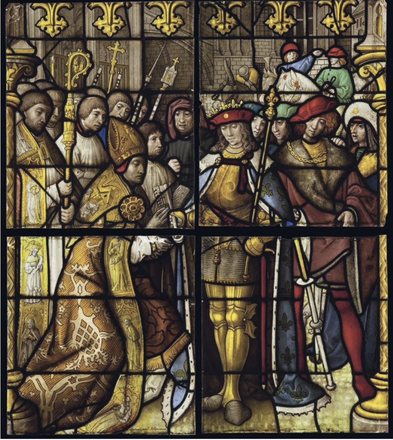 Another commission from his early career in Paris was the design for a stained glass window of The life of St. Paul and St. Aldric for the church of Saint-Pierre and Saint-Paul in Ferrières-en-Gâtinais (Loiret), near Paris. This was commissioned by Abbot Louis de Blanchefort. The coat of arms in the tympanum belongs to the abbot, who passed away in 1507.