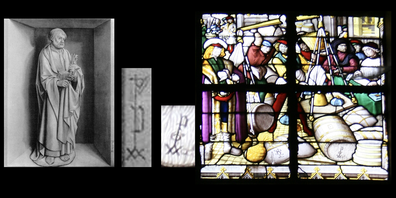 The case for identifying the artist as Gauthier is based on an overwhelming amount of specific uncommon pattern usage and the unique style which is shared between his known stained glass works and his paintings. I won't repeat all the examinations discussed in the François Ier article, but one example that is worth mentioning is the very similar monogram/House Mark in the stained glass in Tournai and the grisaille reverse of the eponymous The Mass of Saint Giles.