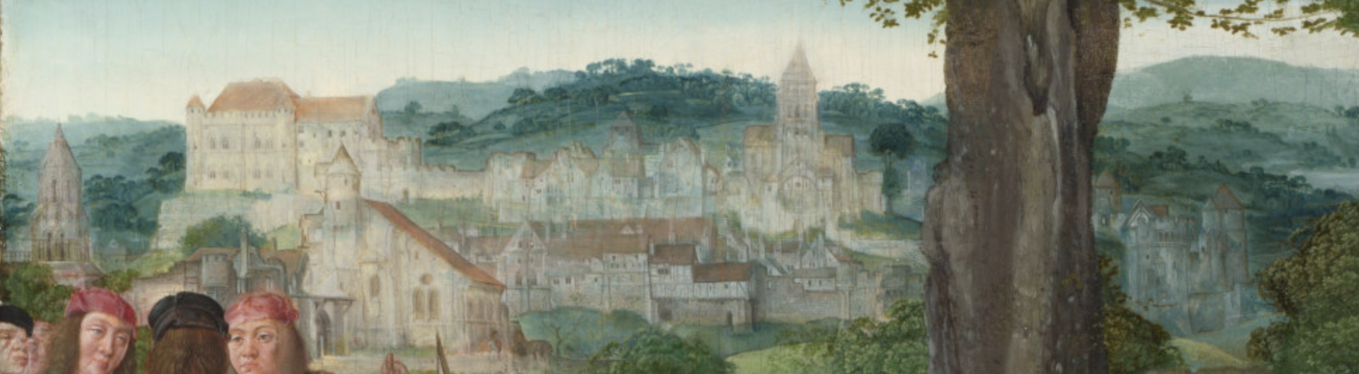 On the subject of cartography, the artist painted a detailed town in the background of The Mass of Saint Giles. Earlier in the 20th century the town in the background was identified by Montesquiou and Hinkle as Pontoise in France, 32 kilometers north-west of Paris. This was challenged by Lorne Campbell in the catalogue of the National Gallery, and it may be worth further research to confirm the location of the background.